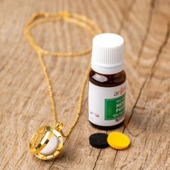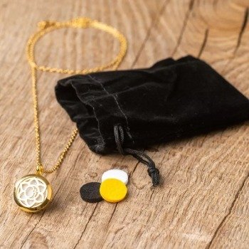 De geurhanger Calicéa bestaat uit een goudkleurige roestvrijstalen medaillon + gouden ketting 70cm + zwart fluwelen tasje + 3 vilten pads.