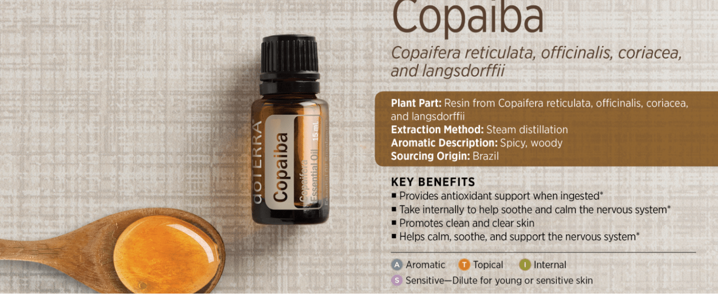 Copaiba essentiële olie is afkomstig van een geurige tropische boom uit Zuid-Amerika. Sinds de 16e eeuw wordt de copaiba essentiële olie gebruikt in de traditionele gezondheidspraktijken van de oorspronkelijke inwoners van Noord- en Noordoost-Brazilië. Copaiba olie wordt veel gebruikt in cosmetische producten zoals zepen, crèmes, lotions en parfums om het vermogen de huid te kunnen verzachten. Breng aan op de huid in combinatie met een draagolie of een moisturizer voor het gezicht om een gezond uitziende huid te ondersteunen.