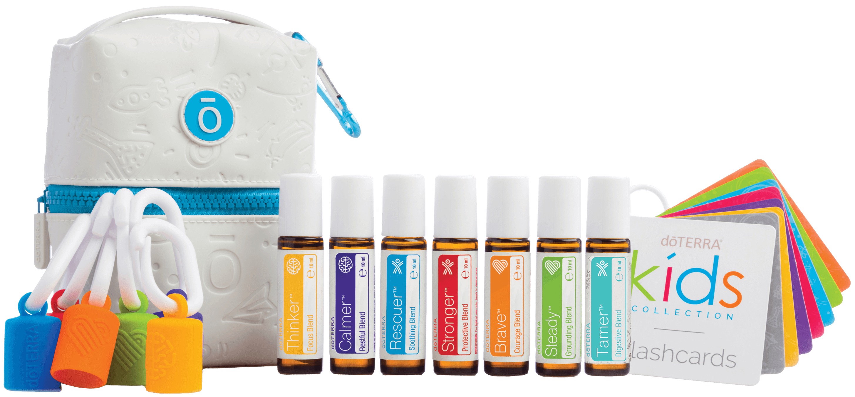 Calmer™ (10 ml roller), Stronger™ (10 ml roller), Rescuer™ (10 ml roller), Steady™ (10 ml roller), Tamer™ (10 ml roller), Brave™ (10 ml roller), Thinker™ (10 ml roller), zes siliconen doppen met karabijnhaakjes, instructie flashcards en een draagtasje met karabijnhaakje.