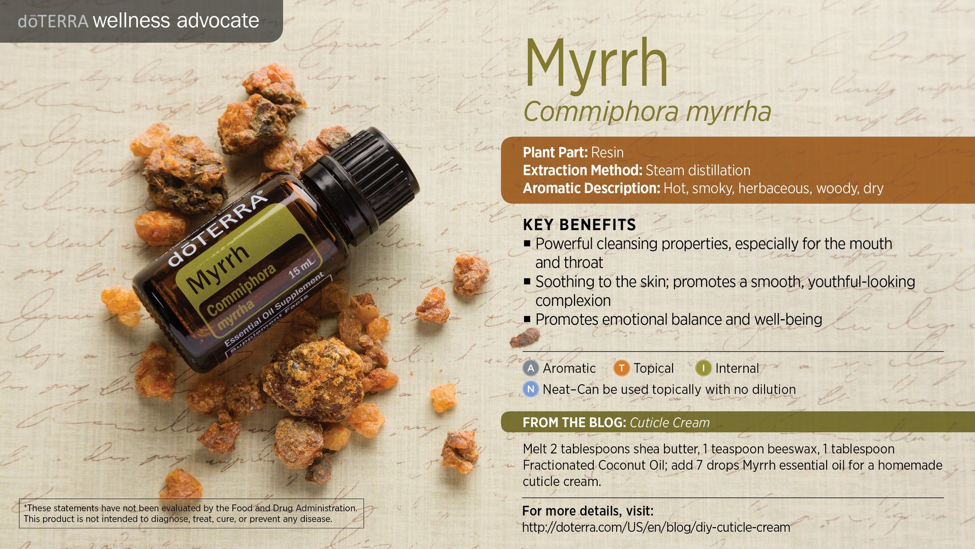 Als Wierook de “Koning der Oliën” is, dan is Mirre zeker aanwezig aan het Hof. Mirre is een belangrijk onderdeel van doTERRA Salubelle en vele andere huidverzorgingsproducten vanwege de weldadige werking op de teint van de huid. Mirre wordt van oudsher gebruikt tijdens meditatie en voor balsemen, en het blijft een waardevolle en onmisbare olie in elke verzameling van essentiële oliën.