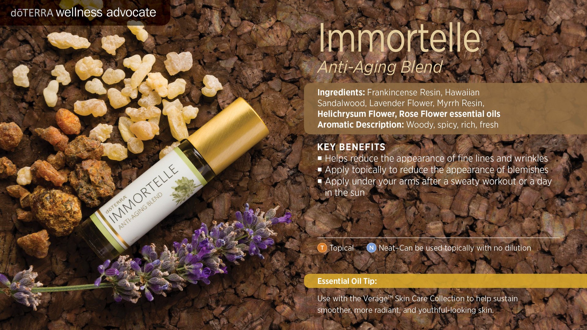 Boswellia Carterii Olie, Santalum Paniculatum Hawaïaanse Sandelhoutolie, Lavandula Angustifolia Lavendelolie, Commiphora Myrrha Mirreolie, Olie uit de bloemen van Helichrysum Italicum (Kerrieplant), Olie uit de bloemen van Rosa Damascena (Roos), Limonene*, Linalool*, Geraniol*, Citronellol**Natuurlijke oliebestanddelen